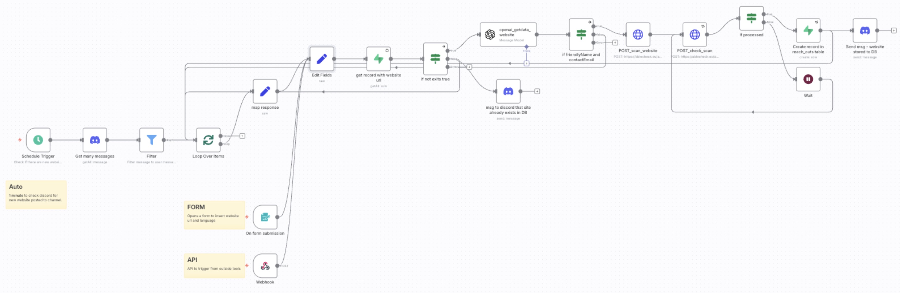 - Ocenjevanje dostopnosti: Namenski n8n projekt je vzel URL spletne strani iz baze podatkov, ga pognal skozi naš lastni skener za dostopnost spletnih strani in posodobil vnos v bazi z dobljeno oceno.