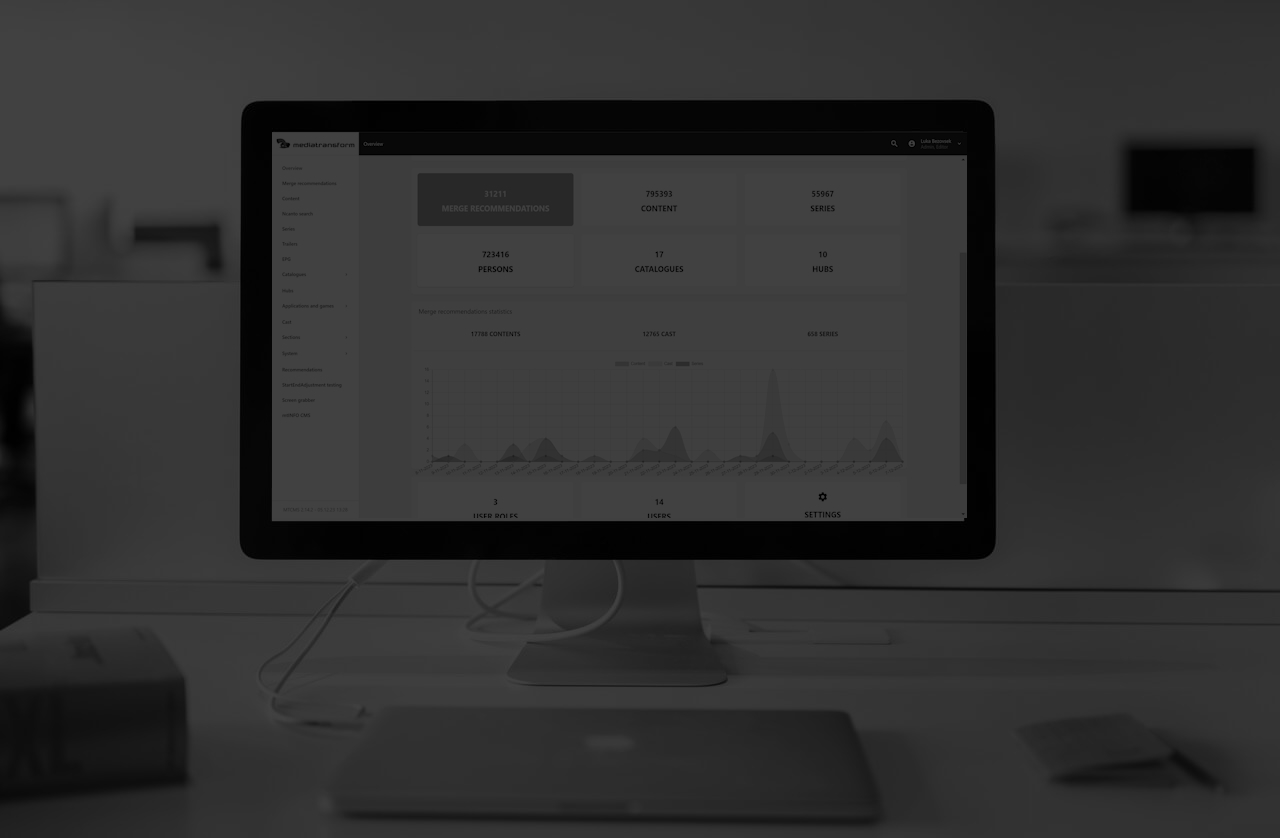 MediatransformCMS je zmogljiv sistem za upravljanje vsebin, posebej zasnovan kot sistem za celovito urejanje metapodatkov interaktivnih IPTV vsebin. Omogoča zbiranje, obdelavo, obogatitev in prikaz vsebin z visoko učinkovitostjo. Temelji na NoSQL arhitekturi in uporablja sodobne rešitve, kot so REST API z uravnoteženjem obremenitve, večprocesni sistem z message queueing, ter napredne mehanizme za predpomnjenje. S tem zagotavlja zanesljivo delovanje tudi v okoljih z veliko količino podatkov in visoko frekvenco zahtevkov. Uredniški frontend omogoča enostavno upravljanje vsebin in metapodatkov preko uporabniku prijaznega vmesnika.